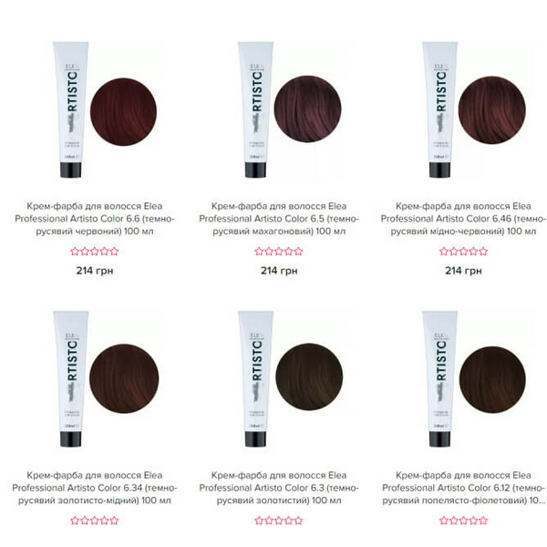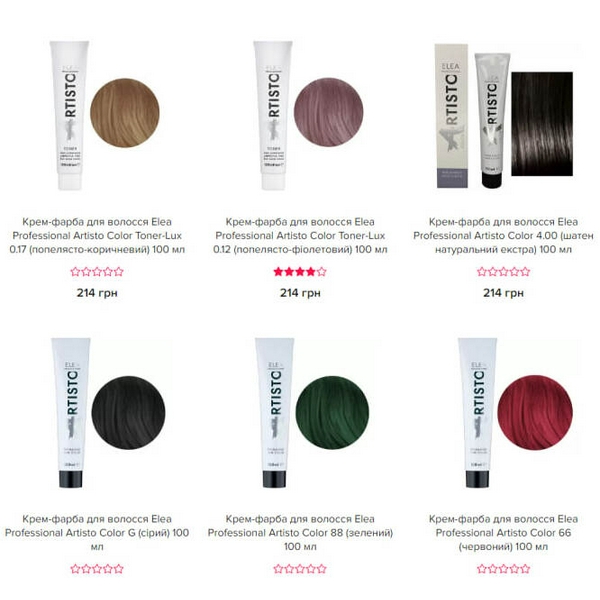 Elea Professional Artisto Color – крем-фарба болгарського виробника для стійкого фарбування та тонування волосся. Спеціально розроблена для професійного застосування та представлена великою кількістю відтінків, палітра складається з 96 кольорів. Всі відтінки мають насичений колір, 100% зафарбовує сивину, а також відмінно справляються з волоссям, яке погано піддається пігментуванню. Має м'яку дію, не сушить волосся і зберігає здоров'я волосся.